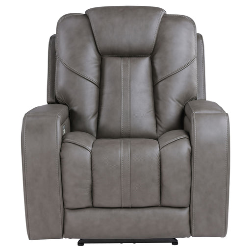 View full detailsThe U8879 Power Recliner combines modern style with inviting comfort. Upholstered in plush blanche charcoal with contrasting black welt, it feature...