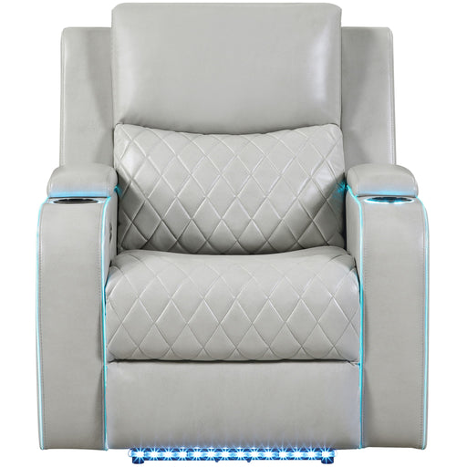 View full detailsThe U8611 Power Recliner is a versatile statement piece for relaxation. Upholstered in soft blanche silver with diamond-pattern stitching, it offer...
