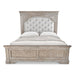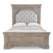Highland Park features vintage styling in a classical bedroom collection. Sturdy construction using hardwood solids and veneers in a multi-step waxed driftwood finish with the perfect amount of distressing. The Panel bed is highlighted by a tall panel headboard and low footboard accented with heavy crown molding and elegant pilasters. A gorgeous shaped cream grey fabric inset in the headboard features button tufting and antique brass nail head trim. Requires a mattress and boxspring - sold separately.