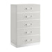 The Europa 5 Drawer Chest in white combines modern elegance with practical functionality. This chest features a sleek, sophisticated look with a gleaming white finish, mylar accents, and acrylic drawer pulls. Quality craftsmanship is evident in the eco-friendly manufactured woods, assembled with durability in mind, and finished with a glossy white topcoat. Upscale extras include a silver mylar pedestal base that elevates the glamour of this piece. The sturdy, well-constructed drawers feature dovetail joinery and ball bearing glides for a durable, easy-glide operation, with interiors finished for snag-free storage. The five spacious drawers provide ample storage for clothing, making this chest both a stylish and practical addition to your bedroom. Choose the Europa 5 Drawer Chest for a blend of contemporary style and high-quality craftsmanship.