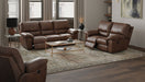 Stetson feature a Transitional 3-over-3 design sofa in a soft faux leather fabric. Quilted accents on lumbar and outside arm panels offer decorative interest while Lay Flat reclining and Power Recline upgrade provide ultimate seating comfort. Stetson is available in two colors: Canyon and Walnut.