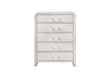 The Malmo Chest provides ample storage with five spacious drawers designed for smooth operation and everyday use. Its light beige oak veneer, rounded edges, and gold-accented acrylic handles reflect the collection'' s modern luxury. Gold trim at the legs completes the look, making this chest a striking yet practical addition to your bedroom suite.