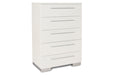 Enhance your bedroom with the Sapphire Modern 5-Drawer Chest in high gloss white. Crafted from high-quality manufactured wood, this chest features a flawlessly smooth, ripple-free surface and a glossy white laminate finish for a sleek, contemporary look. The design is accented by elongated chrome drawer pulls and silver mylar bases that catch and reflect light, creating a striking modern effect. Inside, the roomy drawers offer ample storage with durable dovetail joinery and smooth full-extension slides for effortless use. Combining stylish design with practical functionality, this chest is perfect for adding a touch of sophistication to your space.