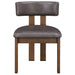 The Cambridge Side Chair blends clean, modern lines with warm, rustic appeal. Crafted from solid Asian hardwoods with a burnished chestnut finish, the chair features a comfortably padded seat and curved backrest upholstered in rich, dark brown vegan leather. The supple faux leather offers the look and feel of genuine hide with added durability and easy care. Its minimalist silhouette and earthy tones make it a versatile choice for dining rooms, game tables, or casual seating areas—perfectly complementing both contemporary and transitional décor.