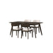 The Piece Mid-Century Modern Wood Dining Set is an ideal blend of style and practicality for your dining space. This set includes a 72" rectangular dining table and chairs, all crafted from solid rubberwood, manufactured woods, and oak veneers for superior stability and longevity. The classic mid-century modern design features a minimalist aesthetic with clean lines, rounded edges, and angled, tapered legs, evoking a timeless elegance. The multi-step walnut brown finish, hand-rubbed with a clear topcoat, highlights the natural beauty of the wood grain. The chairs offer comfortable seating with softly rounded backrests and resilient foam seat cushions wrapped in 100% easy-care polyester fabric. This spacious dining table provides ample room for six, making it perfect for both everyday meals and special gatherings. Enhance your dining experience with this durable and stylish dining collection.