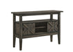 The Gulliver Dining Room Server/Buffet in rustic brown combines functionality with timeless design, making it a perfect addition to your home. This server cabinet is crafted from durable solid rubberwood, manufactured woods, and acacia wood veneers, ensuring long-lasting quality. The multi-step rustic brown finish highlights the intricate wood grain patterns, with subtle notes of gray and charcoal brown adding a touch of sophistication. The design features clean lines and the warmth of distressed wood, seamlessly blending contemporary sophistication with traditional rustic elements. Two X-pattern sliding barn doors provide easy access to ample storage space, perfect for storing china and serving ware, while open shelves offer additional display options. The versatile style of this piece also makes it suitable for use as a TV console or an entryway cabinet. Choose the Gulliver Dining Room Server/Buffet for a stylish and practical storage solution that enhances any space.