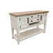 Elevate your dining and entertaining space with the 54 inch sideboard. This stunning piece features a fresh hand-painted Cotton finish with a contrasting Weathered Natural top that offers timeless charm. The solid-metal custom hardware in authentic Burnished Bronze adds a touch of sophistication to this piece. The integrated, Dual AC Power Center makes it easy to keep electric appliances close at hand, making it a practical addition to your space. The two storage drawers, perfect for dining and entertaining essentials, are equipped with ball bearings for smooth opening and closing. The English dovetail joinery gives the drawers added strength and durability. The open, slatted bottom shelf provides flexible storage options, while the built-in storage rack elegantly displays wine bottles. With its timeless multifunctional design, this sideboard adds style, storage and display to any space. The concealed storage behind doors and drawers keeps clutter out of sight, making it a versatile piece for any room.