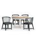 This table and four chair dining set combines style and functionality. Bold contrasting black spindled barrel chairs pair beautifully with the round 48" table with its natural weathered finished top, creating a unique look to freshen your dining space.