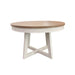 Transform your dining area with the 48 inch round dining table. The fresh, hand-painted cotton finish with a contrasting Weathered Natural top offers timeless charm that will elevate any space. The expandable table top accommodates groups of varying size, making it the perfect choice for any occasion. The fashionable apron reflects vintage influences, giving it a unique and elegant look. The round table seats 4 and converts to and oval shape with the included 18" leaf, accommodating up to 6 people. The gorgeous four-point, open pedestal base creates a stunning aesthetic that is sure to impress. Crafted of poplar solids with birch veneers and and oak veneer top, this table is both durable and beautiful. Integrated levelers make it easy to level and align your furniture, ensuring that it will remain stable.