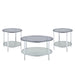 Smoky glass tops, a patterned mirror shelf and a chrome base combine to add sparkle and glam to a room in this romantic set of Living Room tables. Frostine features a round shape that softens a room and makes it easier to navigate by eliminating pesky corners. Use with a Sectional or Sofa and Loveseat sets to add a glamorous touch to your home base